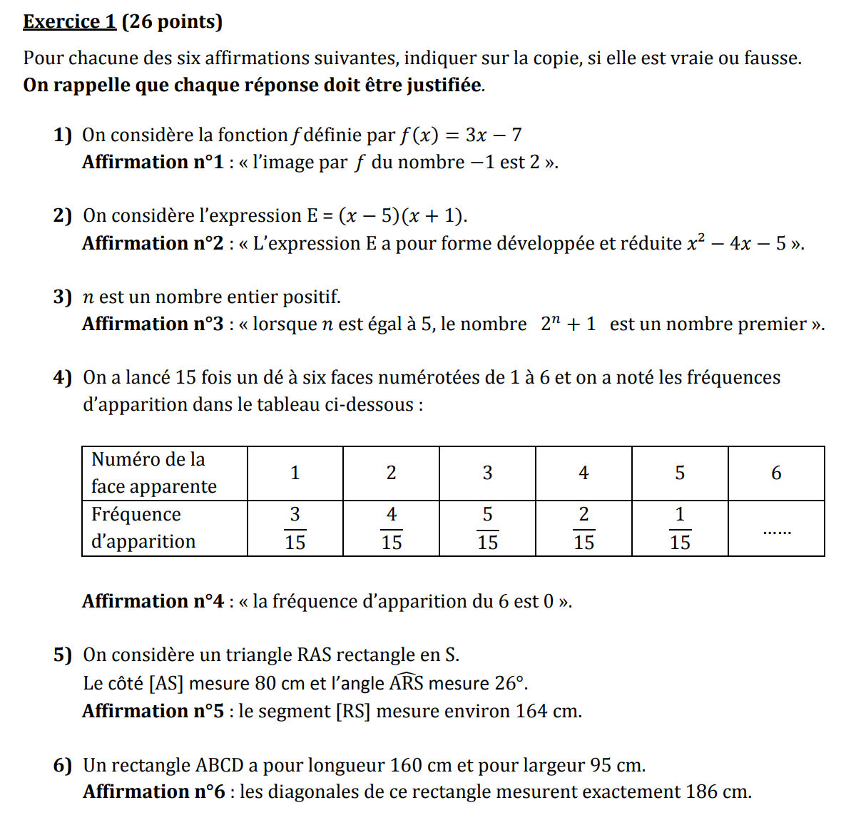 Il en résulte que f6 = 0, donc la fréquence d’apparition du 6 est zéro ! L’affirmation est vraie.
