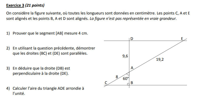 On considère la figure suivante, où toutes les longueurs sont données en centimètre. Les points C, A et E sont alignés et les points B, A et D sont alignés. La figure n’est pas représentée en vraie grandeur.