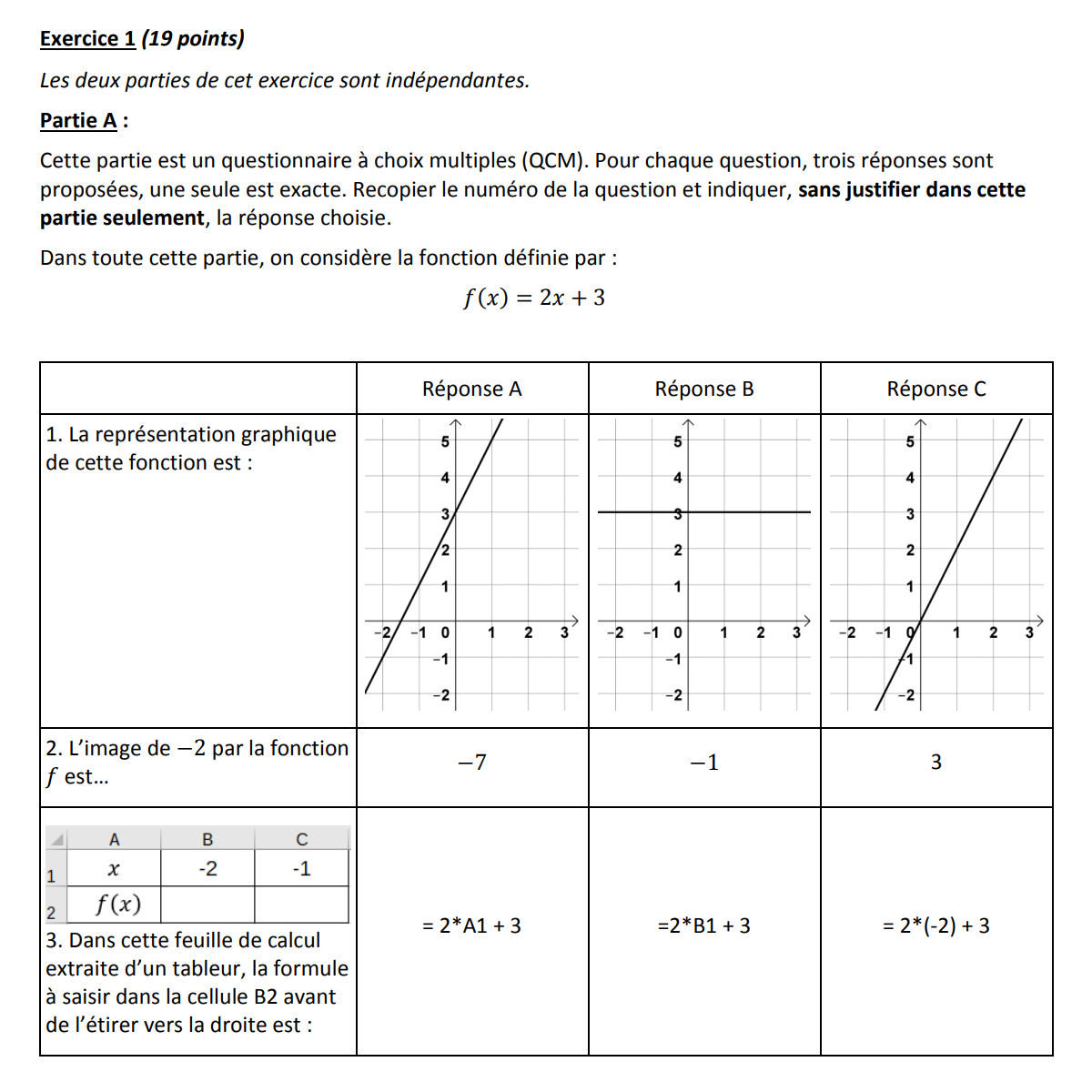 La fonction est « f(x) = 2x + 3 ». Cela signifie que l’image de x par la fonction f est obtenu en multipliant x par 2, puis en ajoutant 3 au résultat. L’exercice consiste à transformer ce calcul en une formule pouvant être saisie au sein du tableur. Une formule au sein d’un tableur commence toujours par le signe égal (« = »). De plus, la multiplication s’écrit à l’aide d’un astérisque (« * »). Dans la cellule B2, on souhaite obtenir l’image de B1 car cette cellule contient l’antécédent. La formule à saisir dans la cellule B2 est donc « = 2*B1+3 ».