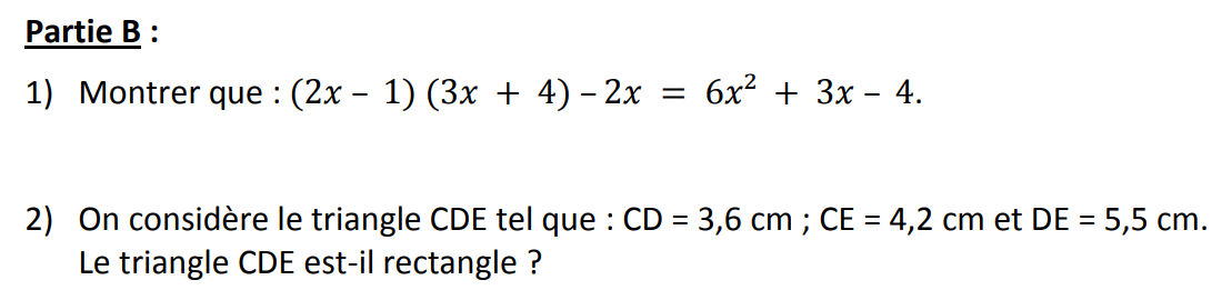 On constate alors que la longueur du plus grand côté du triangle au carré (30,25) est différent de la somme des longueurs des deux autres côtés au carré (30,6). On peut donc conclure que le triangle CDE n’est pas rectangle.