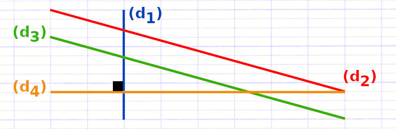 Les droites (d3) et (d4) sont perpendiculaires. L’angle formé entre ces 2 droites est de 90°.