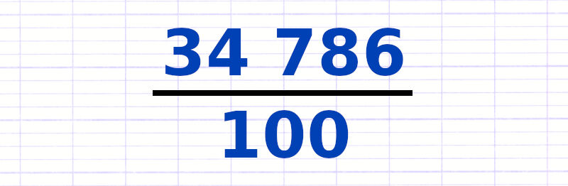 La position de départ de la virgule est à droite des unités (à droite du chiffre 3). Le dénominateur (100) possède 2 zéros, on déplace donc la virgule de 2 rangs vers la gauche. La position finale de la virgule est à droite des centaines (entre 2 et 6).